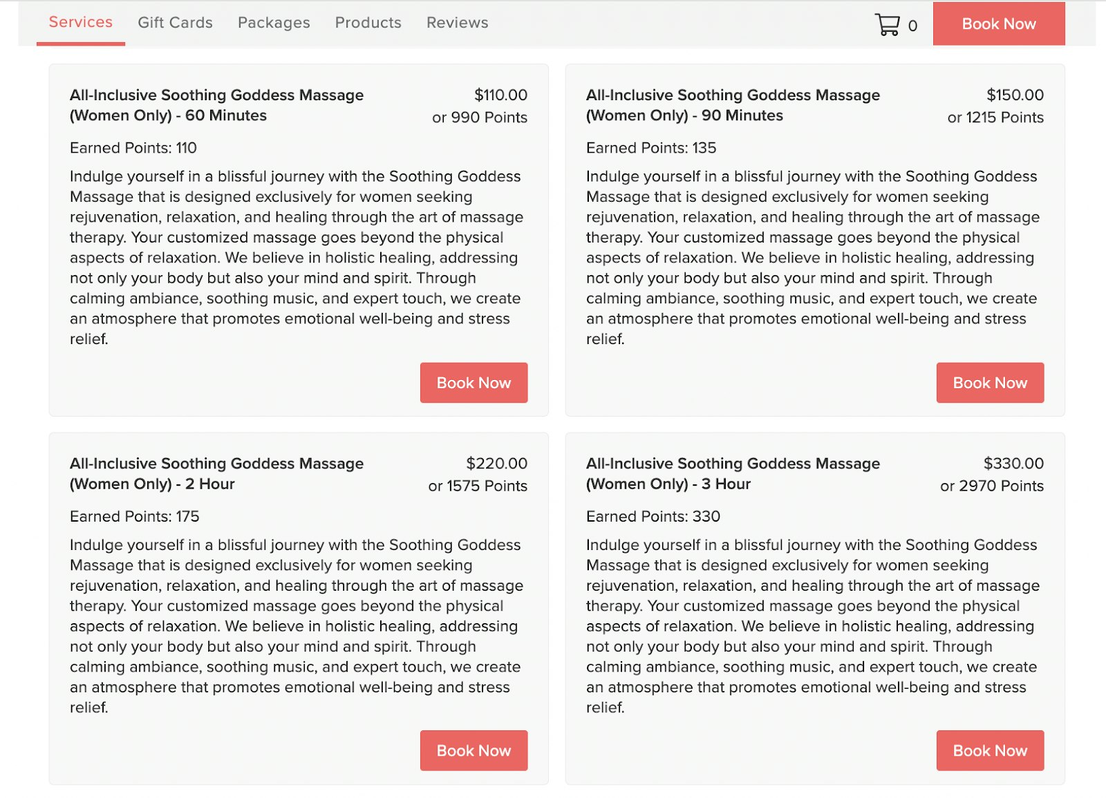 Body Kneads Spa uses a loyalty program instead. Each time you book a service at the spa, you get points that can be redeemed for a pretty nice discount on a future service.
